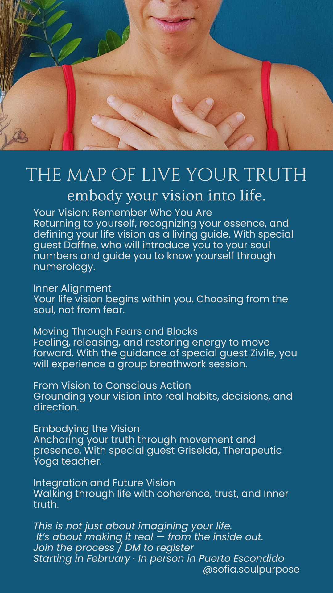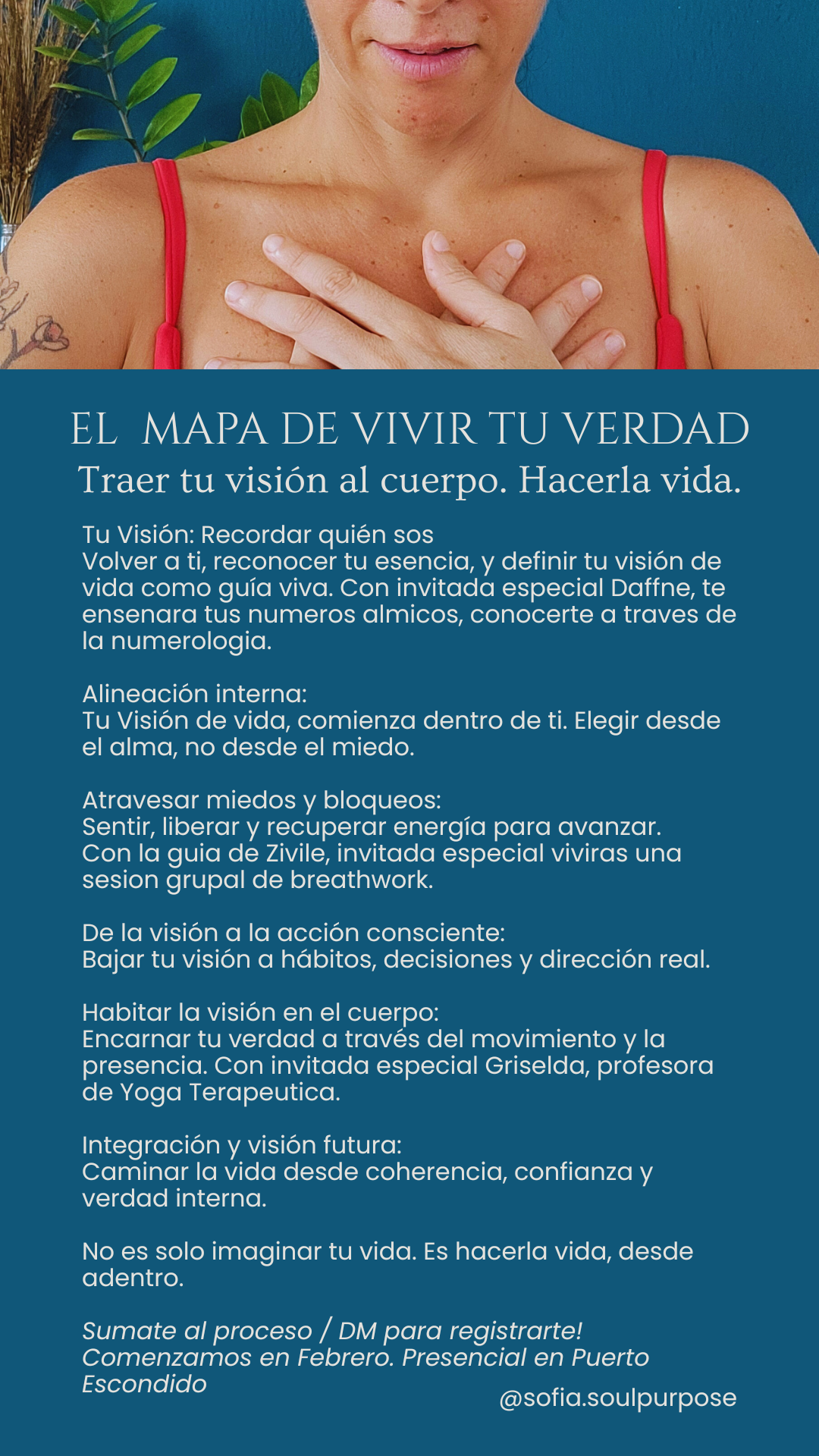 Este proceso combina coaching ontológico, numerología, breathwork, yoga, meditación y prácticas de embodiment, para que tu visión no se quede en lo mental, sino que se vuelva una experiencia vivida.